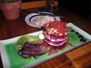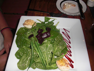 Next, I had the beet salad which was stupendous and a work of art! Alex’s spinach salad with green beans and deviled eggs was gentle and tasty. Our main courses were the rib eye steak with Stilton cheese fritters (yum!) and a bone-in pork chop with a sweet onion bread pudding (worth every calorie).